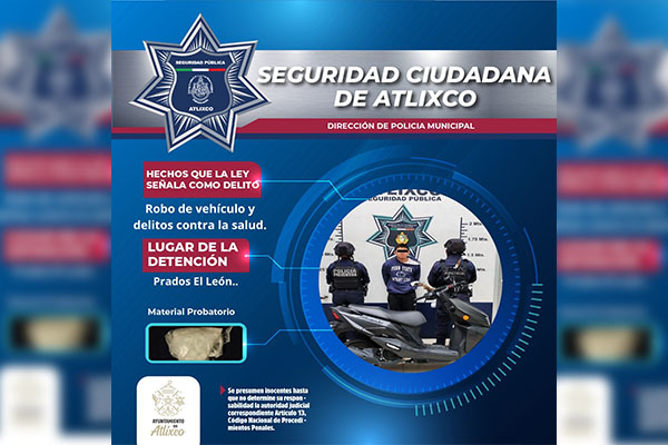 Los hechos ocurrieron cuando un ciudadano solicitó apoyo a la Policía de Atlixco tras el robo de su vehículo en la colonia Santa Rosa Chapulapa. Minutos después, los oficiales ubicaron la motocicleta sobre la calle 3 Poniente; el sospechoso intentó huir, pero fue alcanzado y asegurado en la colonia Prados El León.
