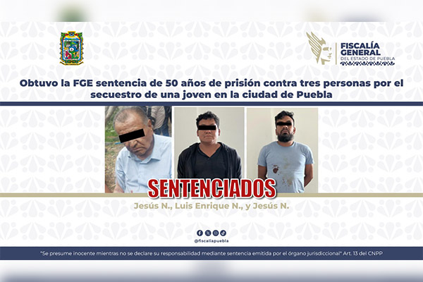 La Fiscalía General del Estado logró una sentencia de 50 años de prisión al presentar pruebas técnicas suficientes que acreditaron la responsabilidad de Jesús N., Luis Enrique N. y Jesús N., de 71, 29 y 34 años de edad, respectivamente, en el secuestro de una joven en la ciudad de Puebla.