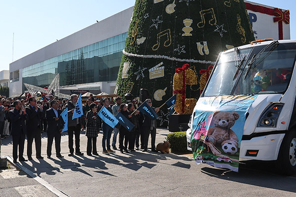 La rectora de la BUAP, Lilia Cedillo Ramírez, en compañía del director del CCU, Flavio Guzmán Sánchez, encabezó el banderazo de salida de la caravana de 8 camiones que entregará el acopio de la campaña "Dona un juguete", en diversos complejos regionales de la institución.