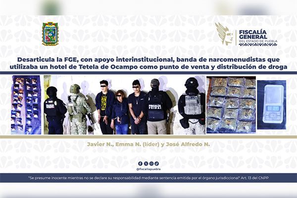 La Fiscalía General del Estado informa que, en seguimiento a las acciones para combatir el narcomenudeo, se llevó a cabo un operativo con apoyo interinstitucional en el municipio de Tetela de Ocampo, donde fue desarticulada una banda presuntamente integrada por Emma N., supuesta líder, así como Javier N. y José Alfredo N.