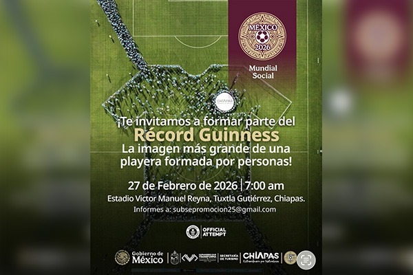 Durante la conferencia matutina, la secretaria de Turismo, Josefina Rodríguez Zamora, informó que el intento de récord tendrá lugar el viernes 27 de febrero en el estadio de Tuxtla Gutiérrez, Chiapas. "Vamos a buscar romper el récord Guinness con más de 4,000 personas formando la playera más grande del mundo".