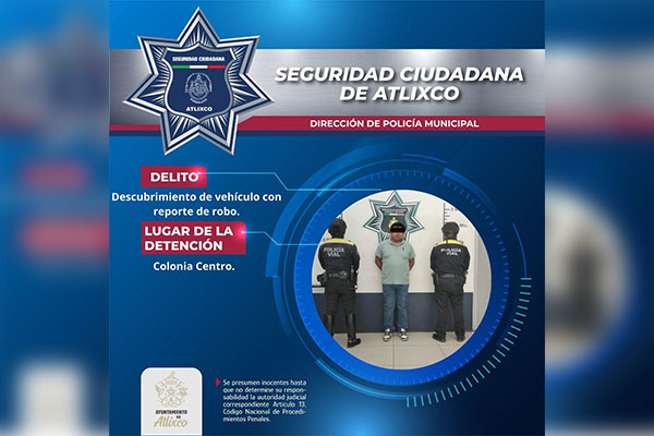 La Secretaría de Seguridad Ciudadana de Atlixco, a través de la Dirección de Tránsito y Vialidad, aseguró una camioneta con reporte de robo y detuvo a un hombre por el probable delito de detentación de vehículo robado.