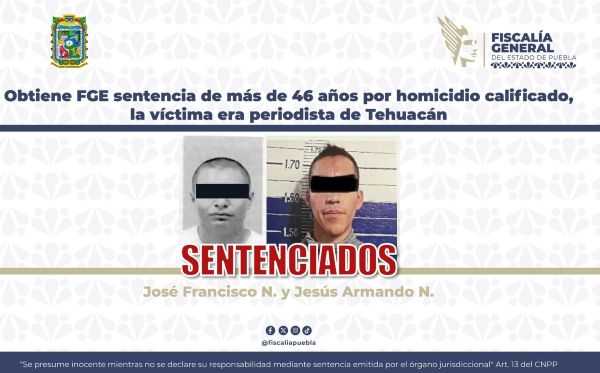 La Fiscalía General del Estado de Puebla (FGE) obtuvo sentencia condenatoria contra Jesús Armando N. y José Francisco N., como responsables del delito de homicidio calificado en agravio de un periodista, hecho ocurrido en el municipio de Tehuacán.