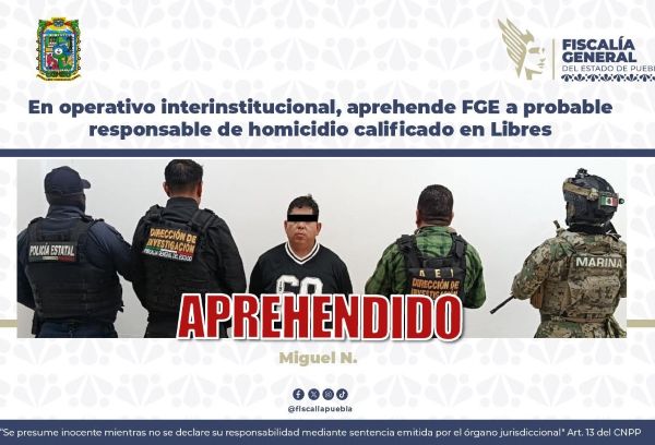 En seguimiento a investigaciones por un hecho violento ocurrido en el municipio de Libres, la Fiscalía General del Estado de Puebla (FGE) cumplimentó una orden de aprehensión contra Miguel N., alias “el Chiltrolis”, de 38 años, como probable responsable del delito de homicidio calificado.