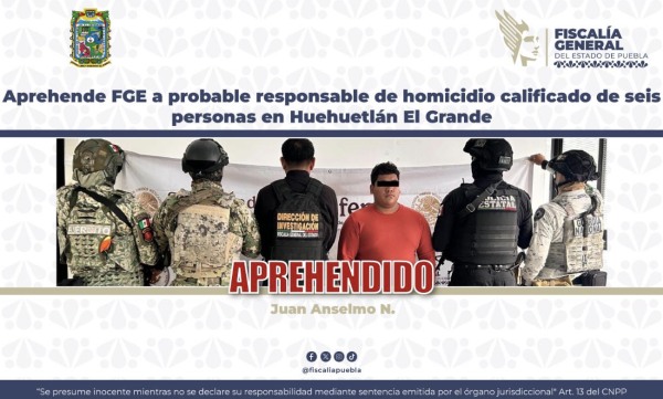 En un operativo interinstitucional, la Fiscalía General del Estado de Puebla (FGE) cumplimentó una orden de aprehensión contra Juan Anselmo N., de 28 años, como probable responsable del delito de homicidio calificado, hecho acontecido en el municipio de Huehuetlán El Grande.