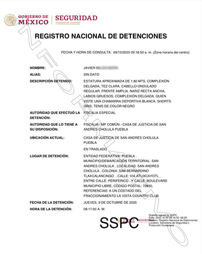 Tras cumplir con la aprehensión, los agentes trasladaron a Javier N. de inmediato a la Casa de Justicia de San Andrés Cholula, ubicada en el Periférico Ecológico para quedar a disposición de un Juez de Control.