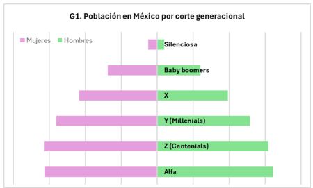 En la siguiente gráfica podemos ver como se distribuye la población en México de acuerdo con las cohortes generacionales que hace la mercadotecnia, como nuestro país se considera joven y en crecimiento, la base de su pirámide poblacional sigue siendo el segmento más ancho, por lo que, la generación Z es ahora el grupo mayoritario, para los siguientes años el grupo más grande serán los Alfa y se espera que sea el último gran grupo porque después la población comenzará a decrecer.