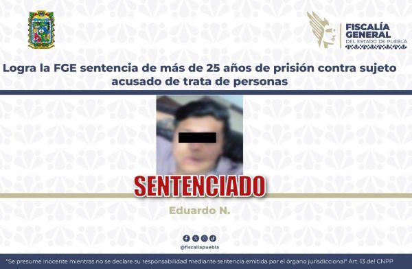 Como resultado de la aportación de diversos datos de prueba por parte de la Fiscalía General del Estado de Puebla, se logró una sentencia de más de 25 años de prisión contra Eduardo N., como responsable del delito de trata de personas, en su modalidad de explotación sexual por prostitución ajena.
