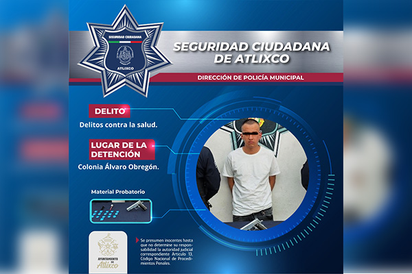 Elementos de la Secretaría de Seguridad Ciudadana de Atlixco detuvieron a un masculino en la colonia Álvaro Obregón por su probable participación en delitos contra la salud.