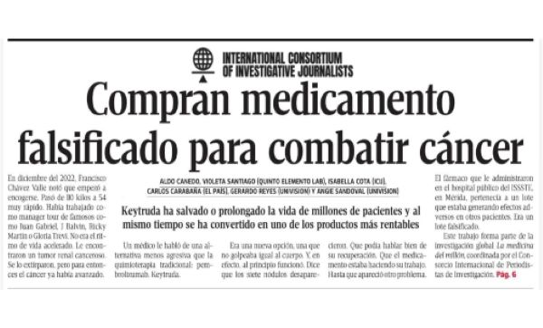 En una investigación internacional coordinada por el Consorcio Internacional de Periodistas de Investigación (The Cancer Calculus), con participación de Quinto Elemento Lab, El País y Univision, se reveló que aquí en México pacientes con cáncer recibieron un medicamento falso en hospitales públicos.